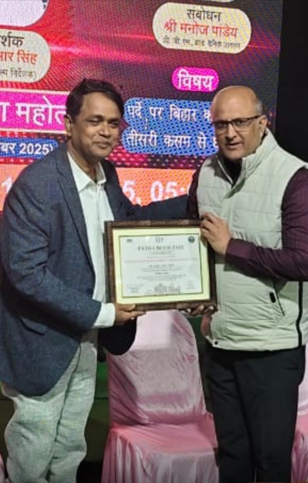 संवाददाता। पटना।पटना पुस्तक मेला में प्रसिद्ध निर्देशक रंजन कुमार सिंह के हाथों भोजपुरी फिल्म इंडस्ट्री के दिग्गज पीआरओ राजीव रंजन कुमार उर्फ़ रंजन सिन्हा को फिल्म पीआर क्षेत्र में उल्लेखनीय योगदान के लिए सम्मानित किया गया।