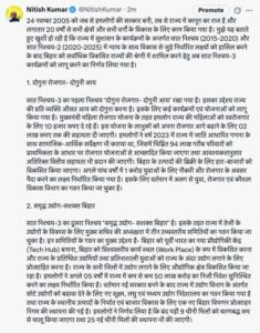 X पर पोस्ट करते हुए इसकी जानकारी देते हुए मुख्यमंत्री नीतीश कुमार ने कहा है कि 24 नवम्बर 2005 को जब से हमलोगों की सरकार बनी, तब से राज्य में कानून का राज है और लगातार 20 वर्षों से सभी क्षेत्रों और सभी वर्गों के विकास के लिए काम किया गया है। मुझे यह बताते हुए खुशी हो रही है कि राज्य में सुशासन के कार्यक्रमों के अन्तर्गत सात निश्चय (2015-2020) और सात निश्चय-2 (2020-2025) में न्याय के साथ विकास से जुड़े निर्धारित लक्ष्यों को हासिल करने के बाद बिहार को सर्वाधिक विकसित राज्यों की श्रेणी में शामिल करने हेतु अब सात निश्चय-3 कार्यक्रमों को लागू करने का निर्णय लिया गया है।